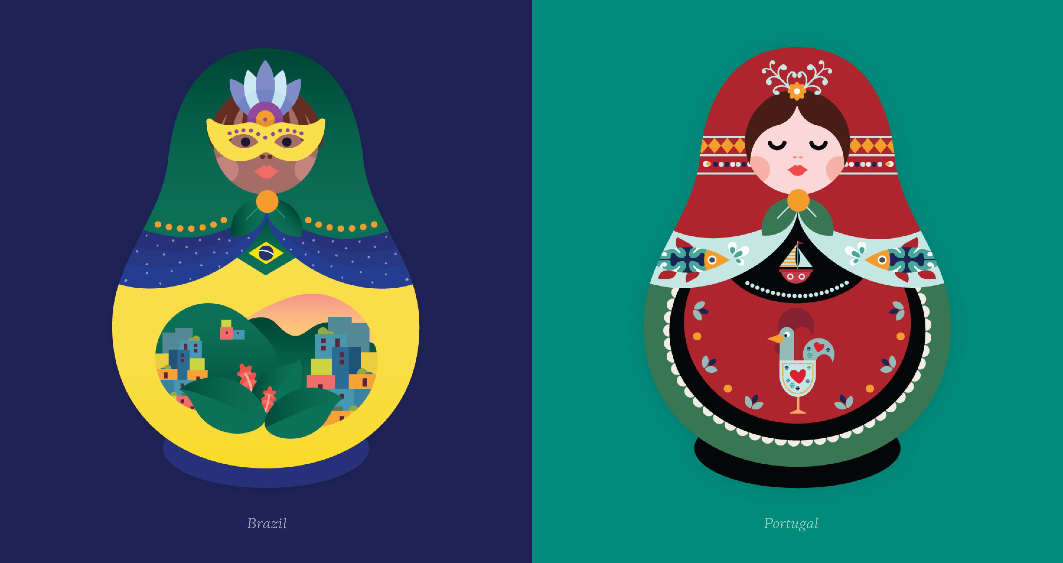 With the World Cup 2018 event, we saw the opportunity to make illustrations alluding to each country. The project consisted of using one of Russia's most representative figures (Matrioskas) and personalizing them with allusive elements to each country.