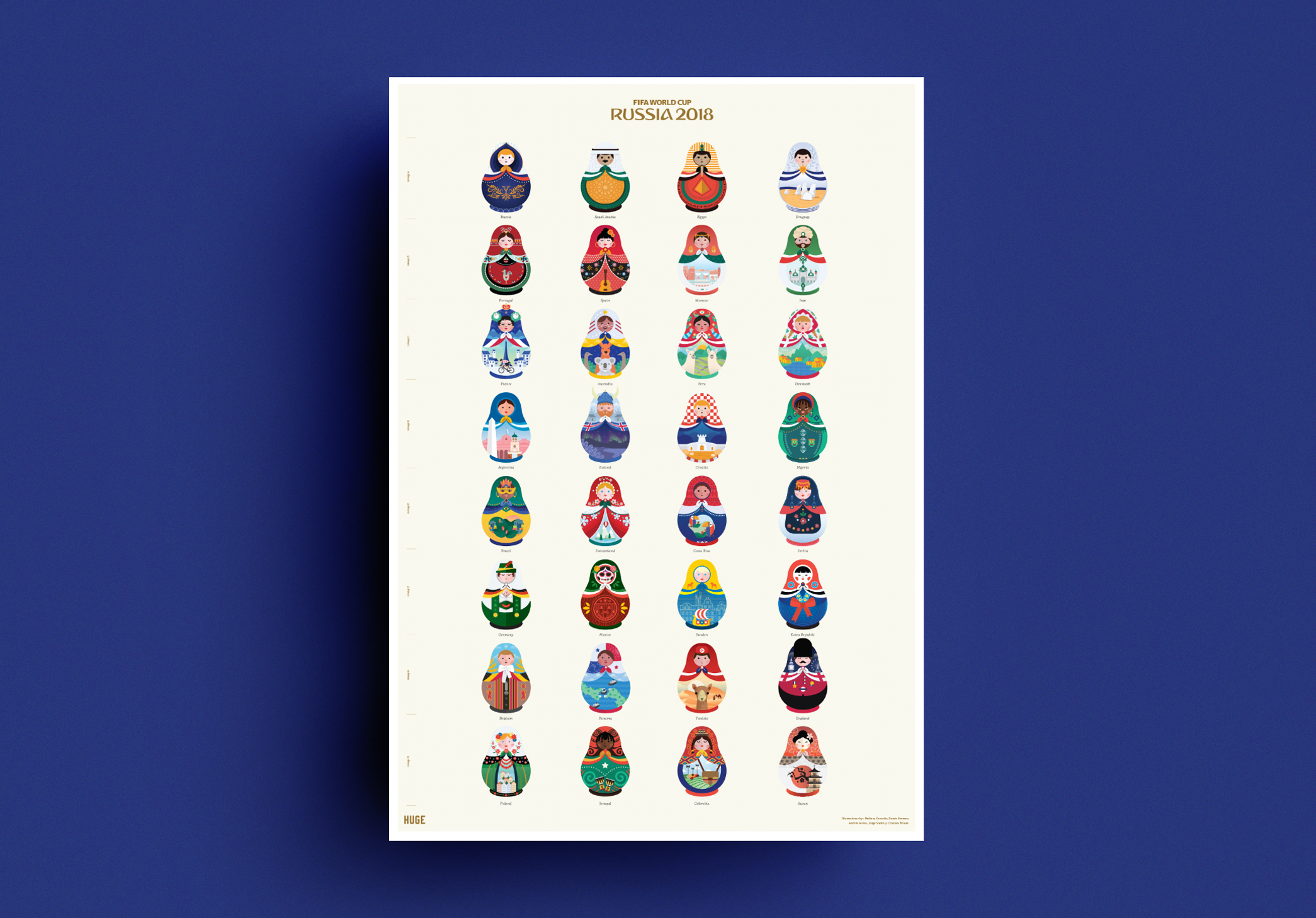 For this project, we had to do a detailed investigation of essential aspects for each country. It was a fun internal project, the final result was amazing, and all Huge offices have the world cup sticker combo.