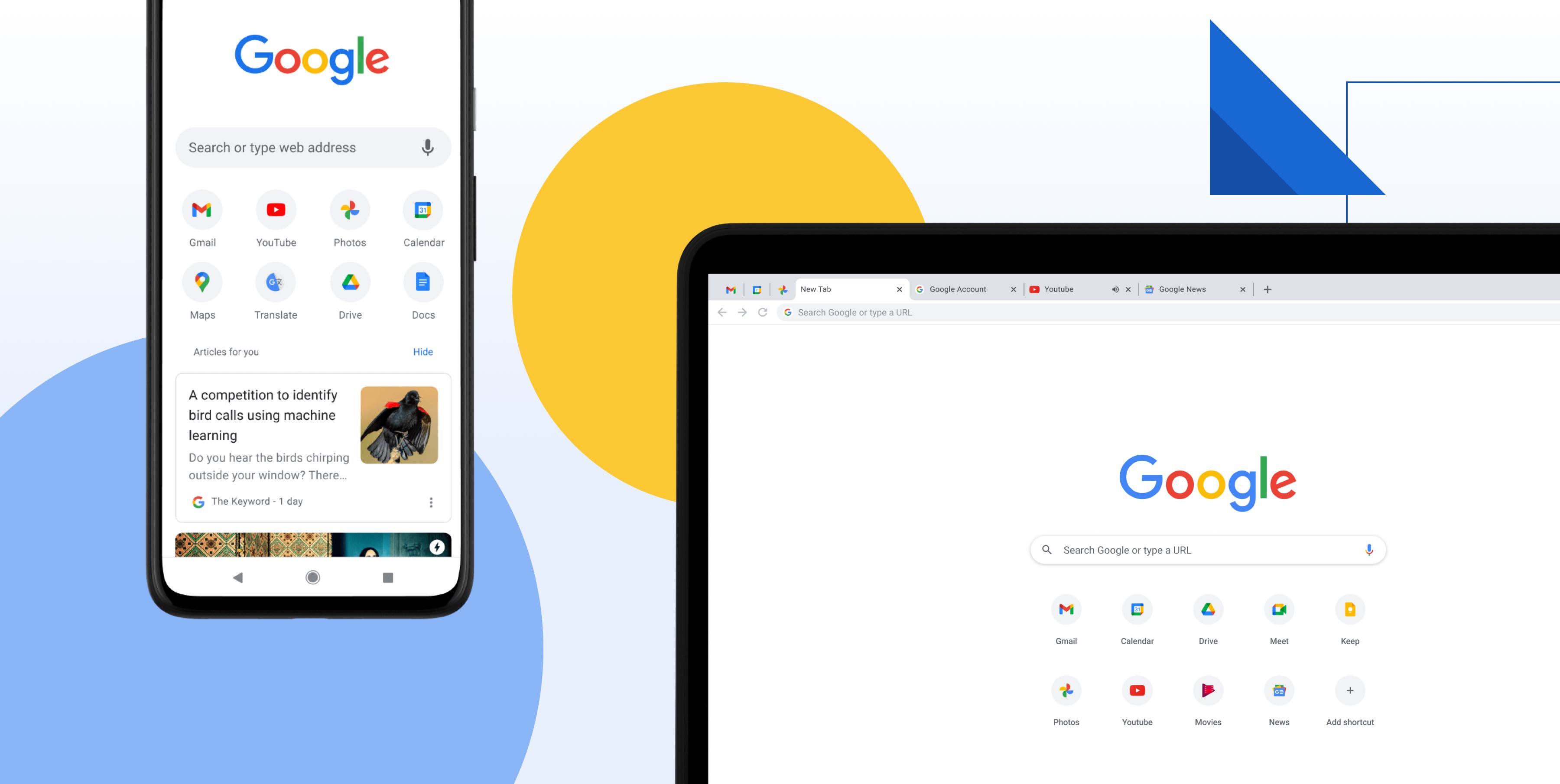 We initially proposed abstracting as many concepts as possible to primary colors and shapes to communicate ideas instead of only showing screenshots. We landed somewhere in the middle, and here is the result. It is playful and friendly, clean, and concise. We wanted to create an experience that closely follows the browser's visual language: simple, subtle shadows for emphasis and flat geometric accents.