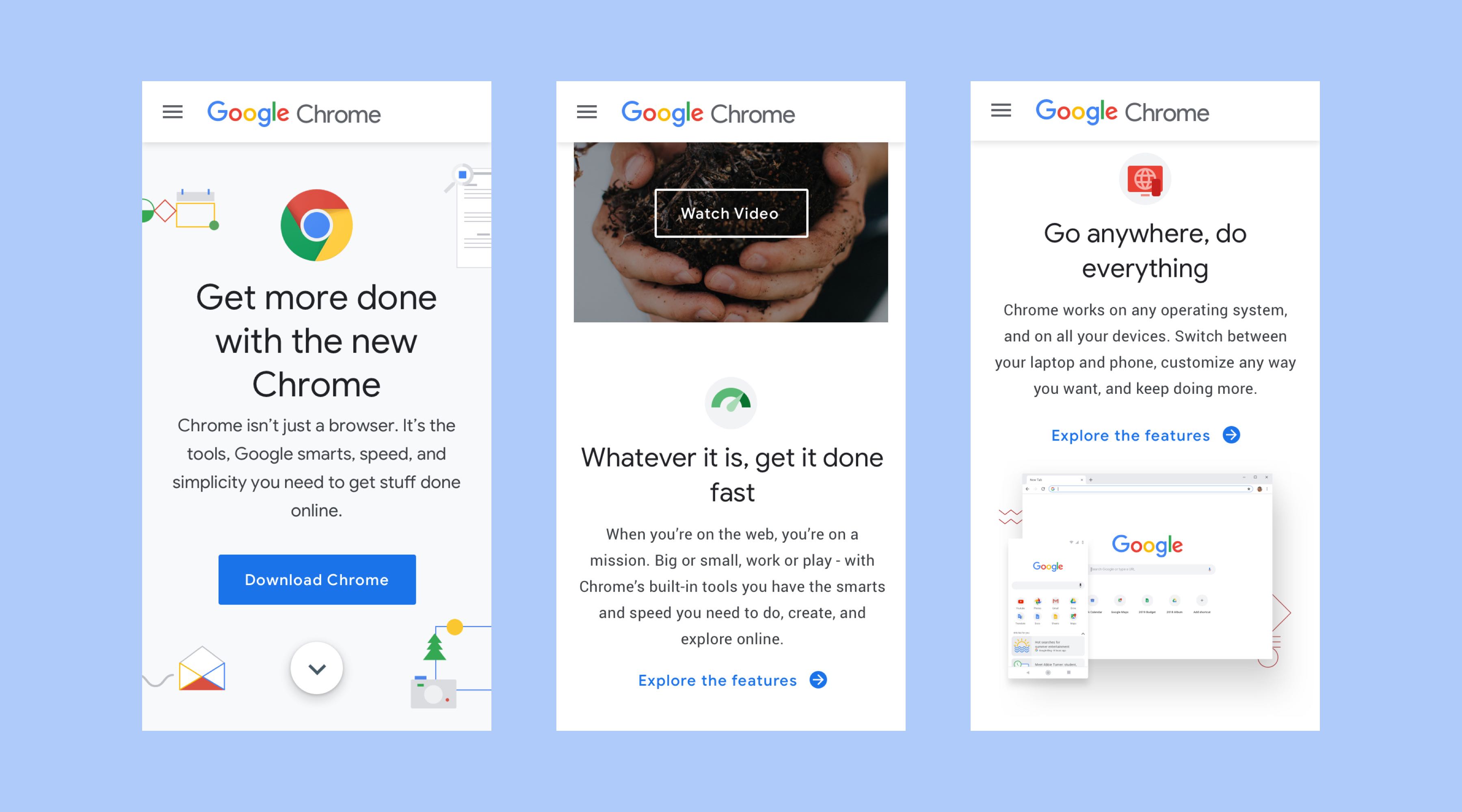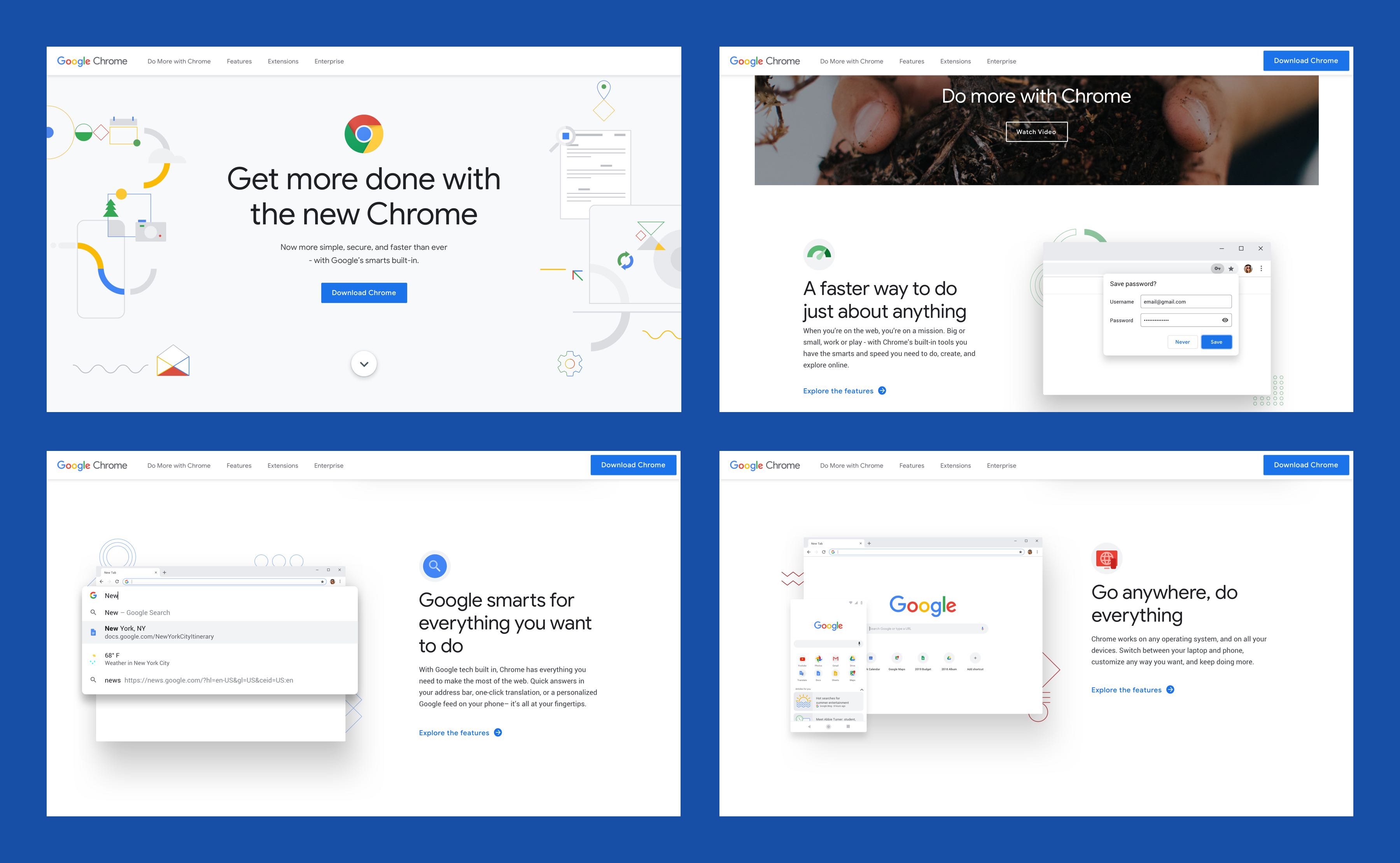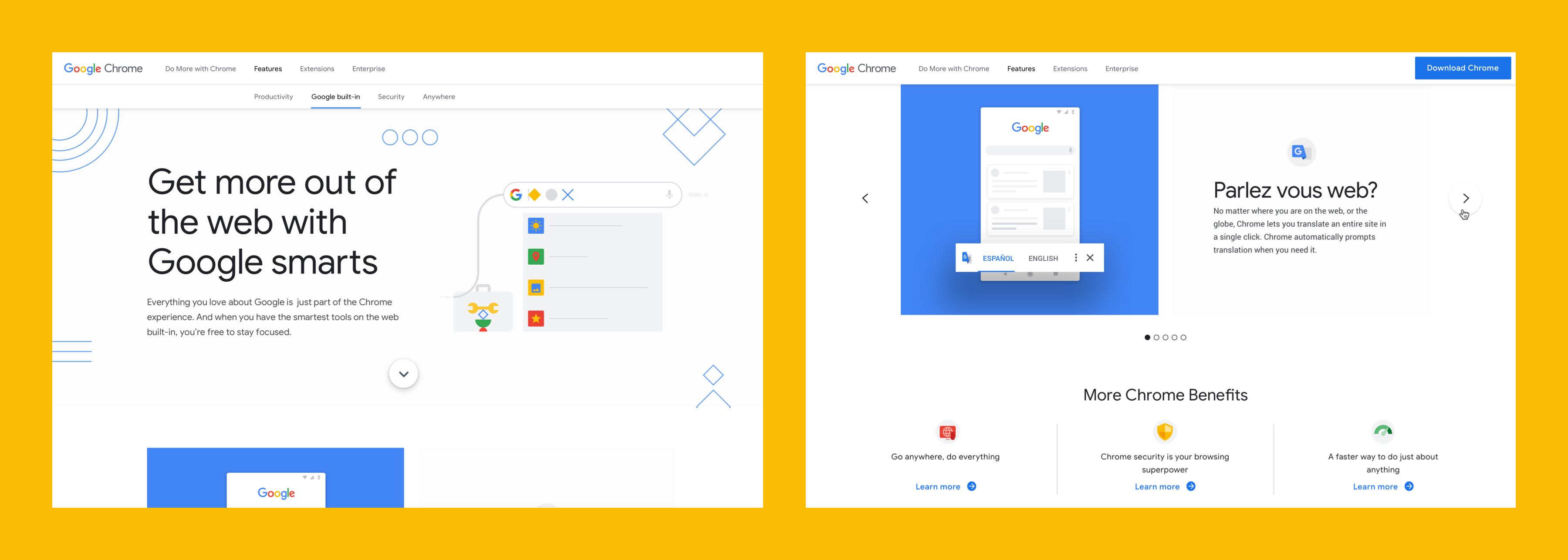 This redesign aimed to elevate the v1 design to a brand-compliant experience with the new Chrome product messaging and positioning. The marketing team wanted it to be “Googley” yet “also different.”